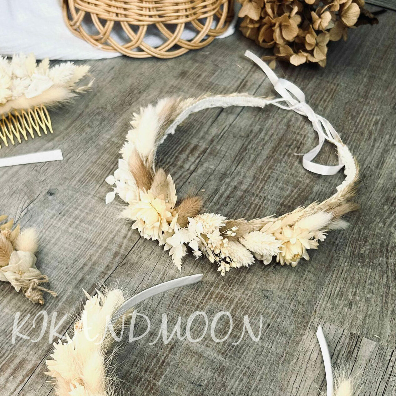 Toutes nos couronnes de têtes sont uniques, créés à la commande. N’hésitez pas à nous laisser un commentaire concernant vos souhaits, un modèle précis, envoyez nous une photo, ainsi, nous réaliserons votre commande dans le même style et les mêmes fleurs que la composition indiquée.