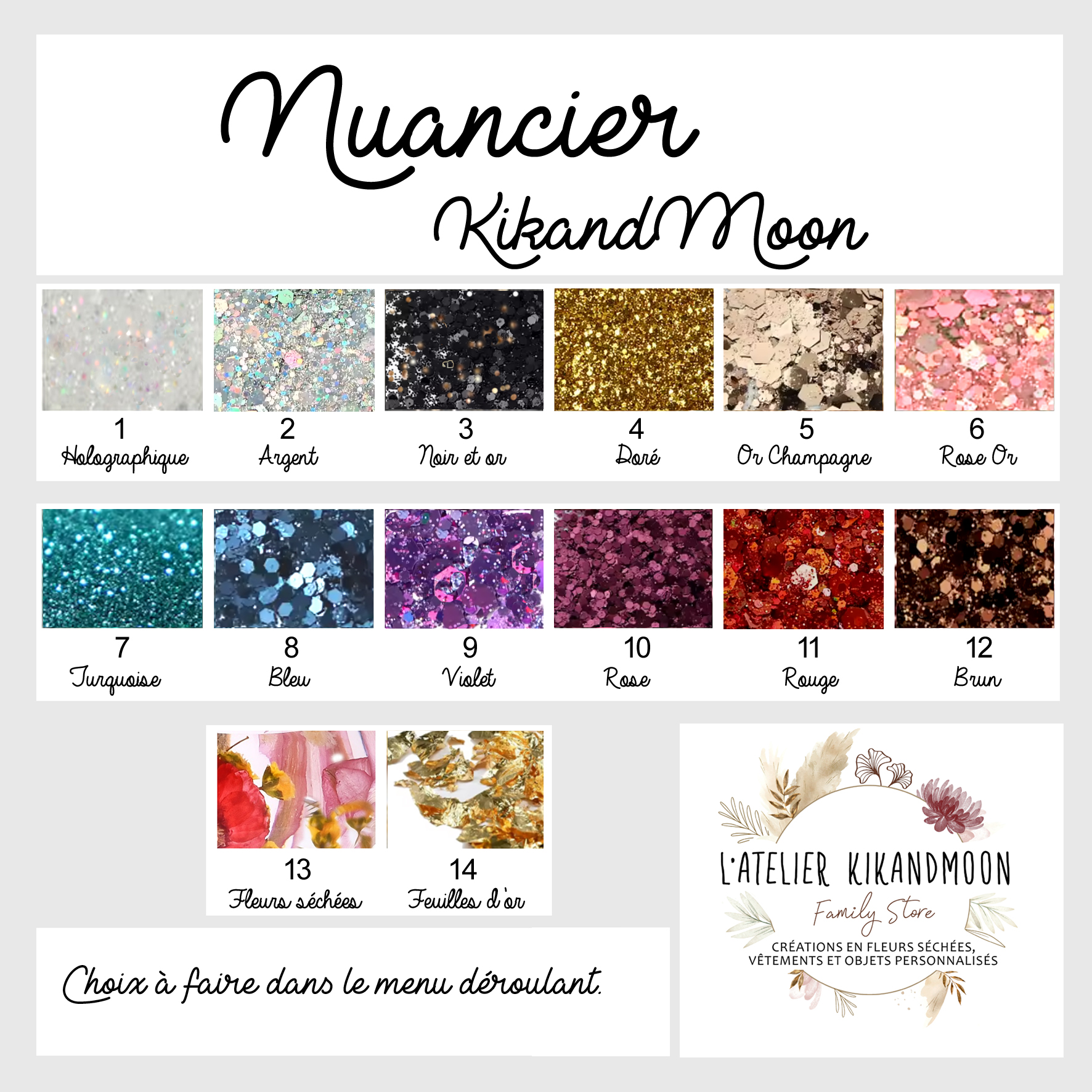 | Couleur du Porte clés | 1 Holographique, 2 Argent, 3 Noir et OR, 4 Doré, 5 Or champagne, 6 Rose Or, 7 Turquoise, 8 Bleu, 9 Violet, 10 Rose, 11 Rouge, 12 Brun, 13 Fleurs séchées, 14 Feuille d'or |