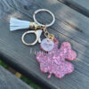 Porte clés : Résine coulée dans notre atelier avec incrustation de paillettes, médaille personnalisée et petit pompon blanc.
